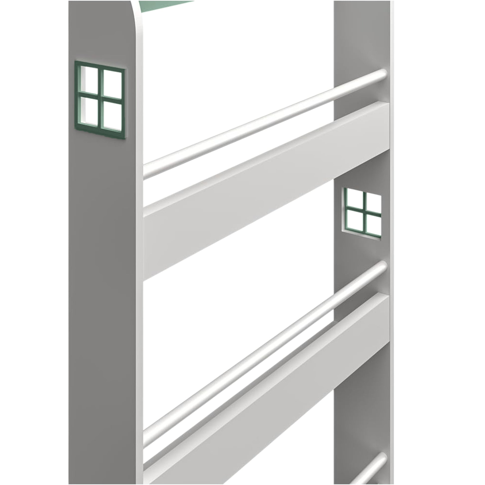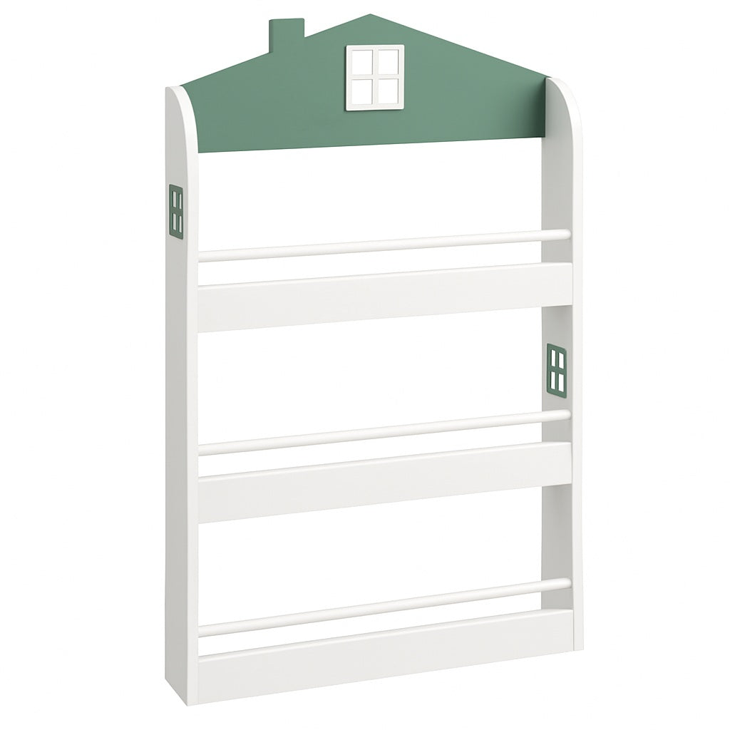 Разполага с 3 отворени рафта, разположени на подходяща за децата височина – удобно и видимо пространство за книги, пъзели, кутии, образователни материали и аксесоари. Благодарение на дизайна тип къщичка с прозорци, етажерката се превръща не само в практична мебел, но и в част от играта и въображаемия свят на децата.