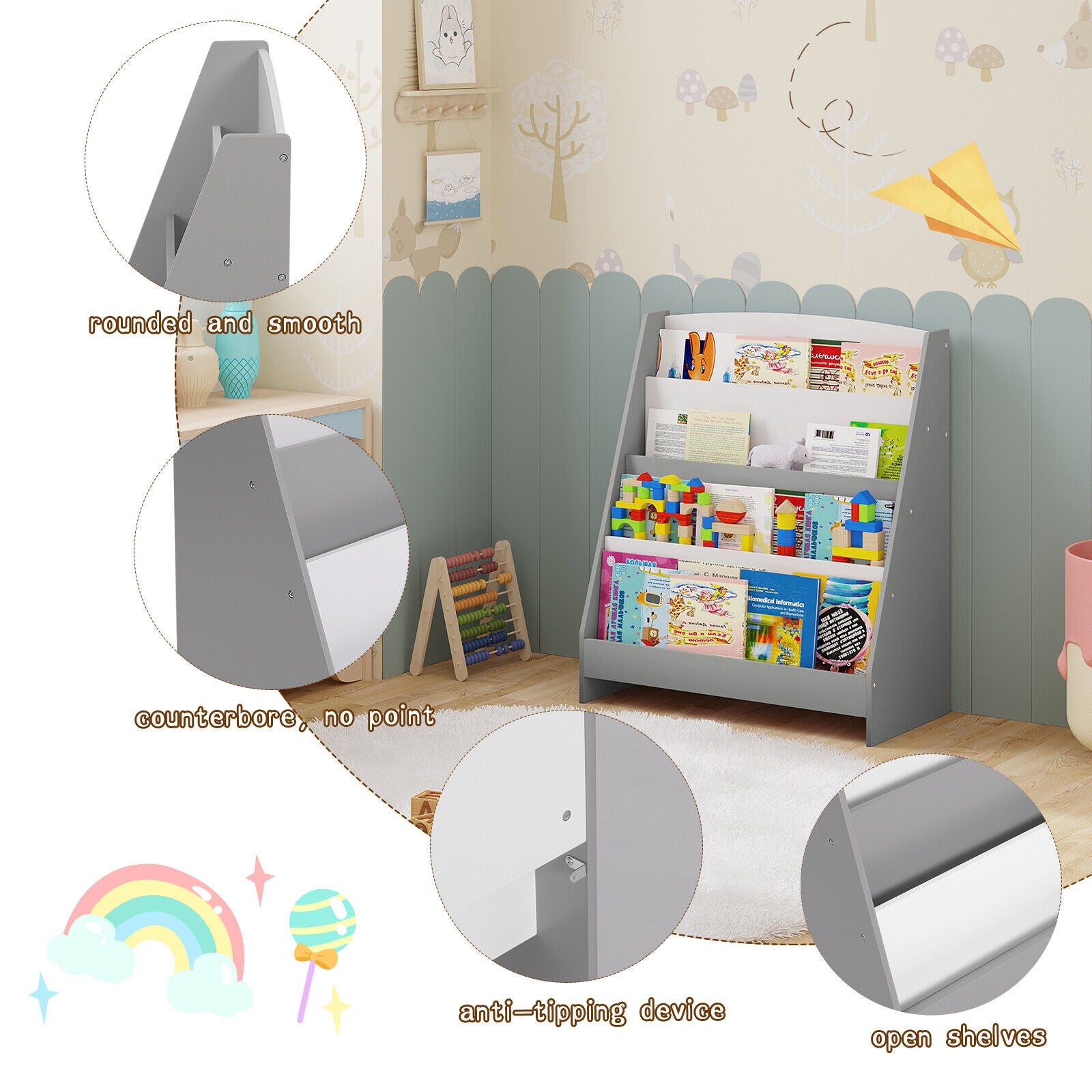 - Осигурява достъпно място за съхранение на книжките и списанията, като насърчава четенето и организационните умения на децата.