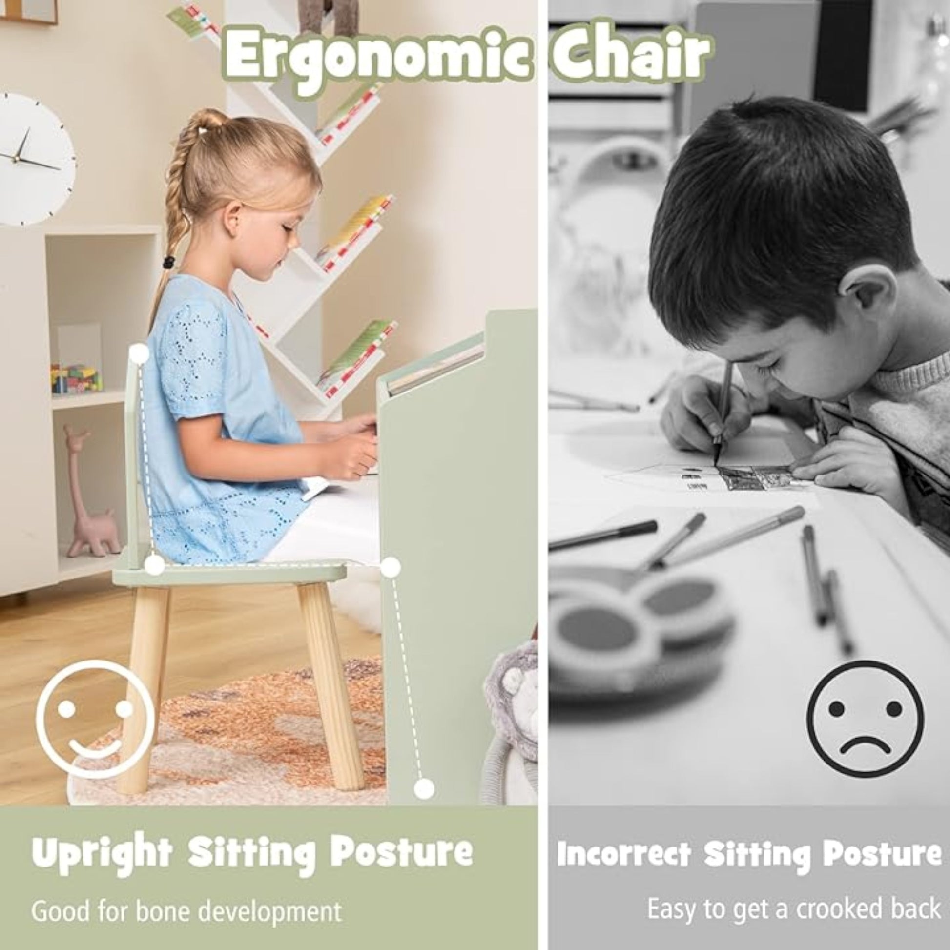 Перфектен размер за деца: Проектиран с подходящи размери за деца, комплектът Детска маса с 2 столчета и черна дъска осигурява удобство и ергономичност.