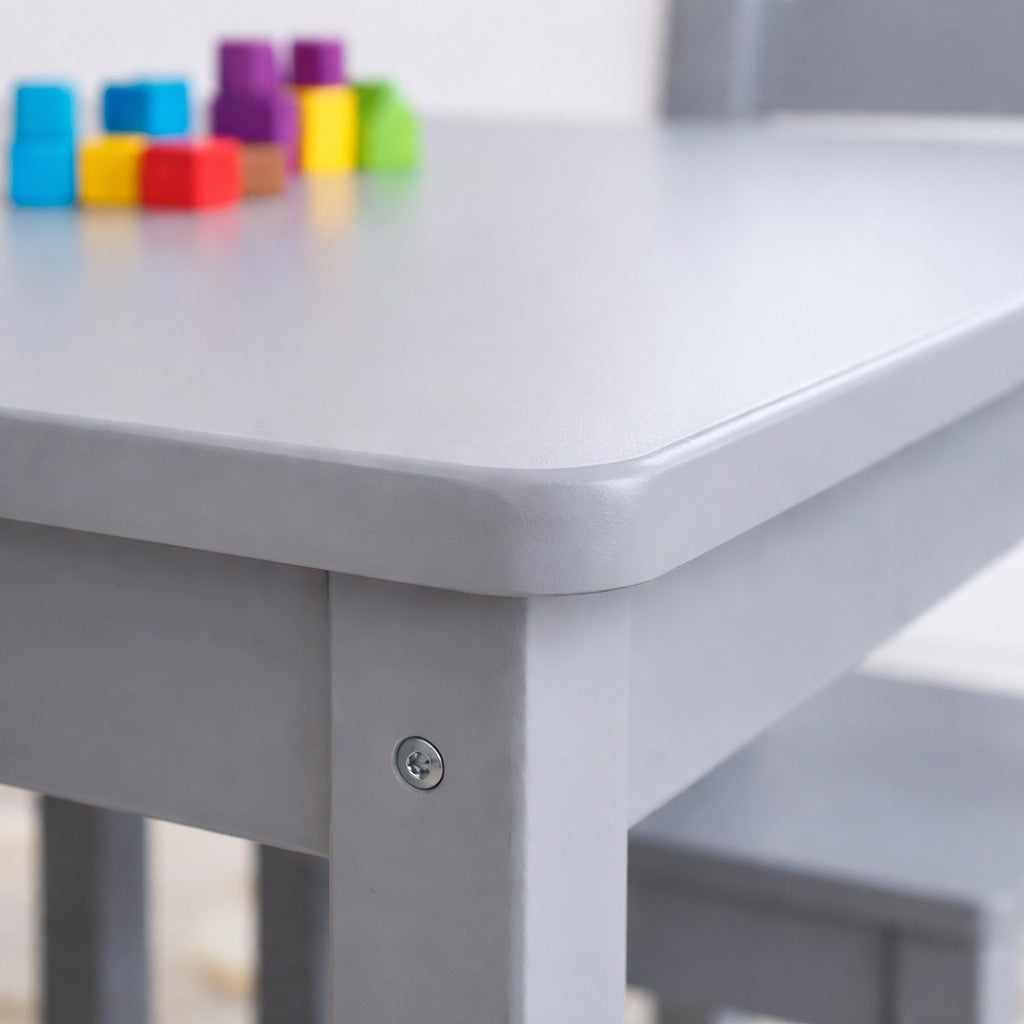 Универсалният сив цвят на детската маса с 4 столчета се комбинира лесно с различни интериорни стилове и е подходящ както за момчета, така и за момичета. Скандинавският дизайн на тази дървена детска маса с 4 столчета придава изчистен и модерен вид, а заоблените ръбове гарантират допълнителна безопасност по време на игра.