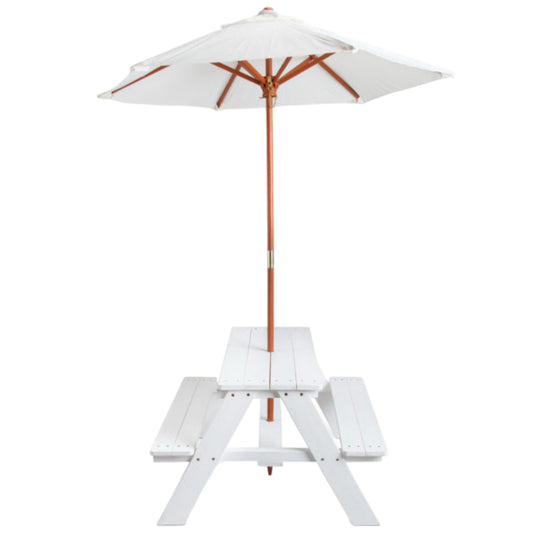 GINGER HOME Set da giardino, tavolo da picnic per bambini, ombrellone anti-UV 30+, in legno, giochi da esterno, bianco, 89x79x50 cm.