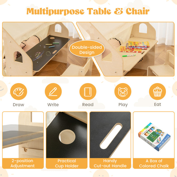 Casetta in legno per bambini 6 in 1 GINGER HOME – Sedia, tavolo, lavagna, organizer, tenda da sole e morbido materassino
