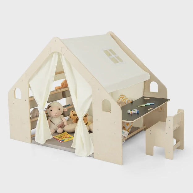 Scegli oggi stesso la casetta in legno per bambini 6 in 1 GINGER HOME con tenda da sole, lavagna, sedia, tavolo, organizer e morbido tappetino e crea uno spazio ideale in cui il tuo bambino possa imparare, giocare e crescere, a casa o all'aperto!