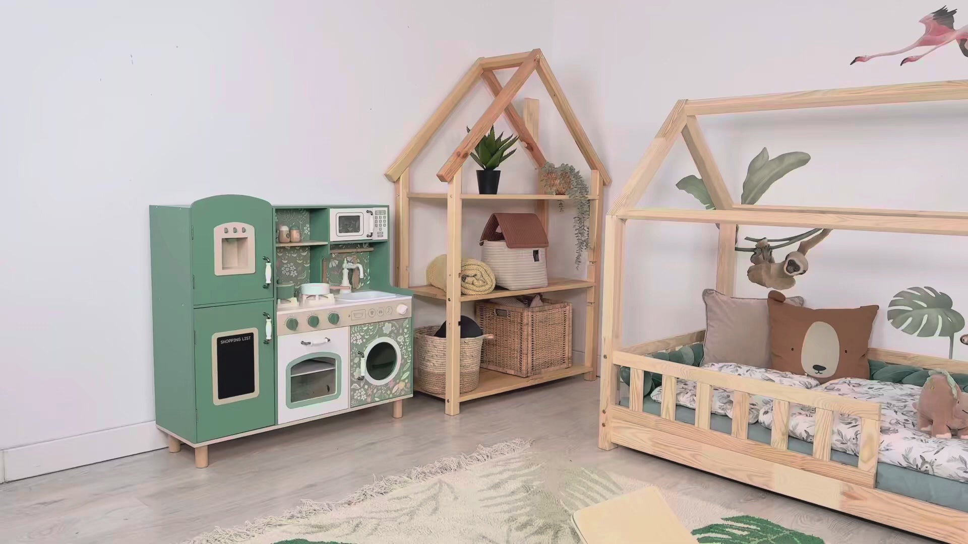 - Realizzata in MDF resistente e sicuro, la cucina garantisce stabilità e durata nel tempo. Il design con motivi floreali vintage e tonalità verdi pastello crea un ambiente elegante e accogliente nella cameretta o nell’area giochi.