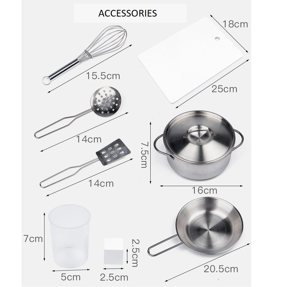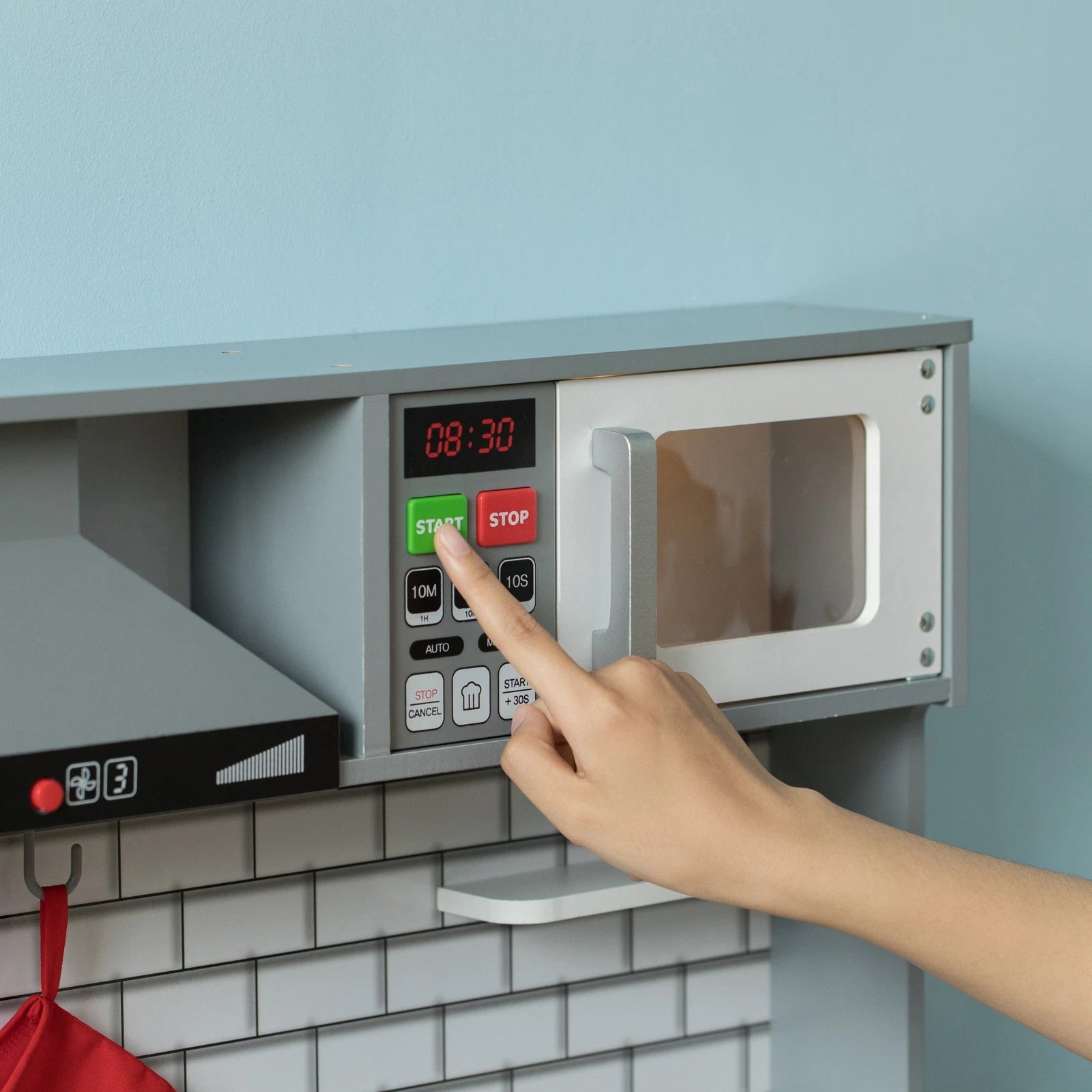 - Il set da cucina in legno per bambini comprende: lavello con rubinetto, frigorifero, macchina per cubetti di ghiaccio, forno, piano cottura, microonde, cappa aspirante, ganci
