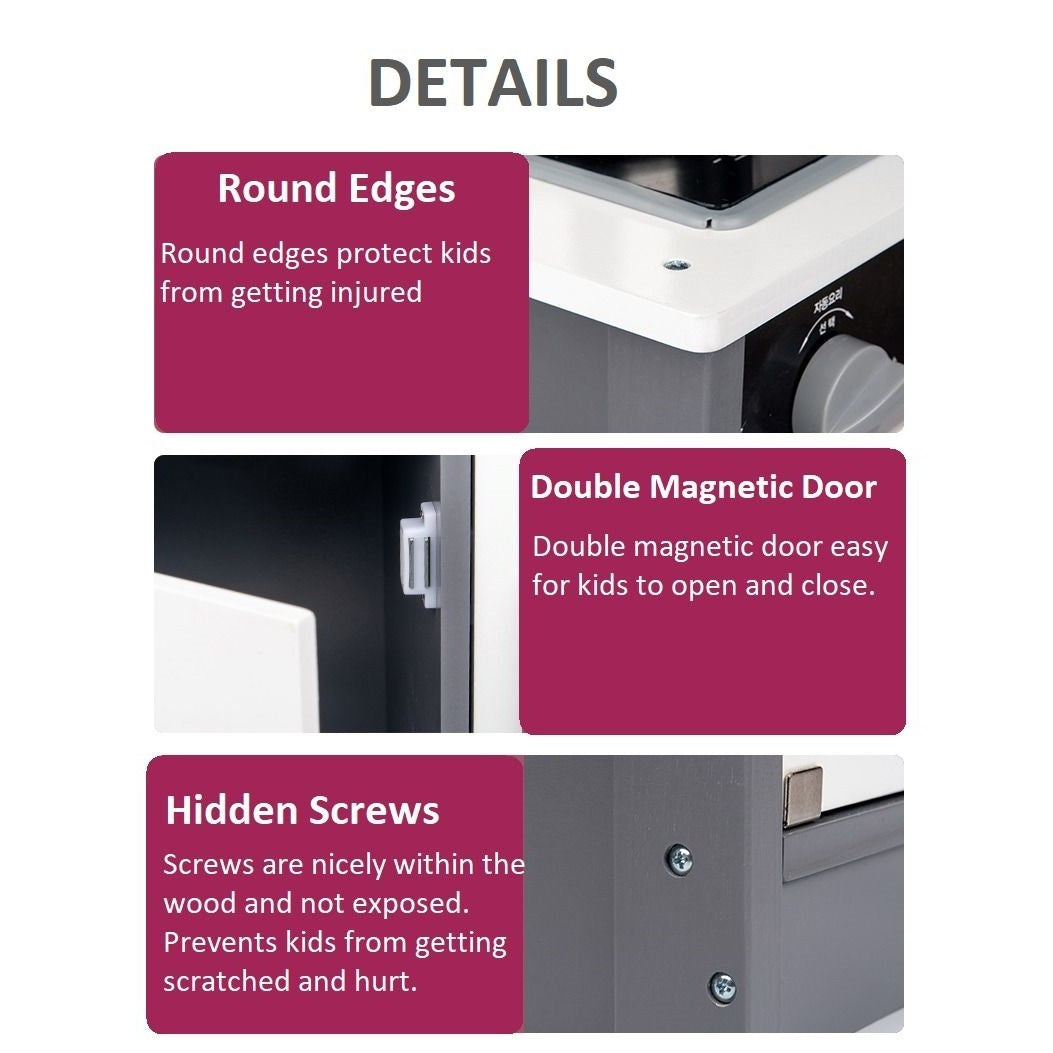 - La cucina in legno per bambini è dotata di numerosi pulsanti e sportelli, che aiuteranno i più piccoli a sviluppare le capacità motorie e i riflessi per afferrare oggetti di forme diverse.