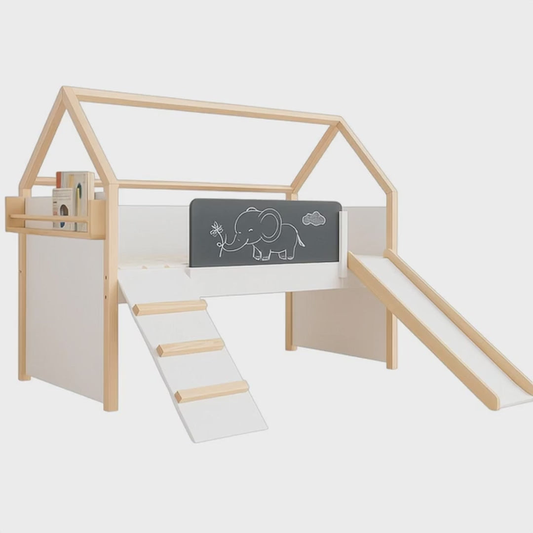 Letto a casetta per bambini GINGER HOME, Montessori, a due piani, scivolo, lavagna, rete per materasso 90x200 cm
